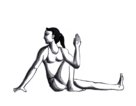Nesta posição, inspiramos lenta, consciente e profundamente, tracionando ao máximo a coluna vertebral e expirando o ar lentamente, torcemos o tronco para a direita, a partir da zona abdominal, procurando olhar sobre o ombro direito.